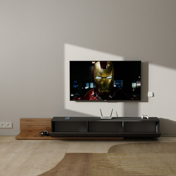 Закрытые фасады формируют аккуратный, лаконичный облик без визуального шума и позволяют скрыть технику, аксессуары и провода. Низкая посадка и вытянутая форма делают тумбу идеальной для размещения под настенным телевизором, усиливая ощущение порядка и современного пространства.