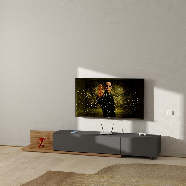 Корпус выполнен в элегантном цвете антрацит, создающем эффект глубины и премиальности, а нижняя платформа с текстурой натурального дерева добавляет тепла и визуального баланса. Контраст материалов подчёркивает современный характер модели и делает её универсальной для интерьеров в стилях modern, minimal, loft.