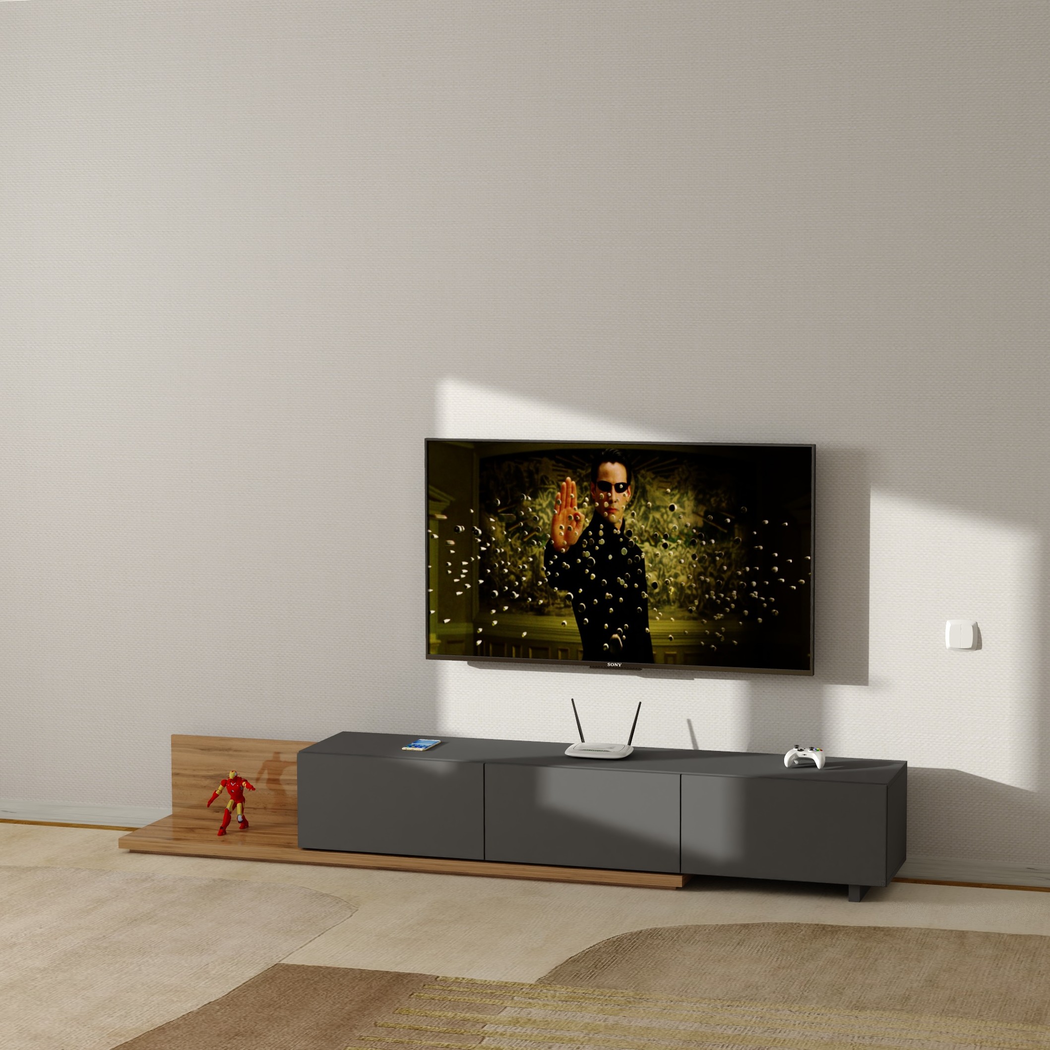 Закрытые фасады формируют аккуратный, лаконичный облик без визуального шума и позволяют скрыть технику, аксессуары и провода. Низкая посадка и вытянутая форма делают тумбу идеальной для размещения под настенным телевизором, усиливая ощущение порядка и современного пространства.