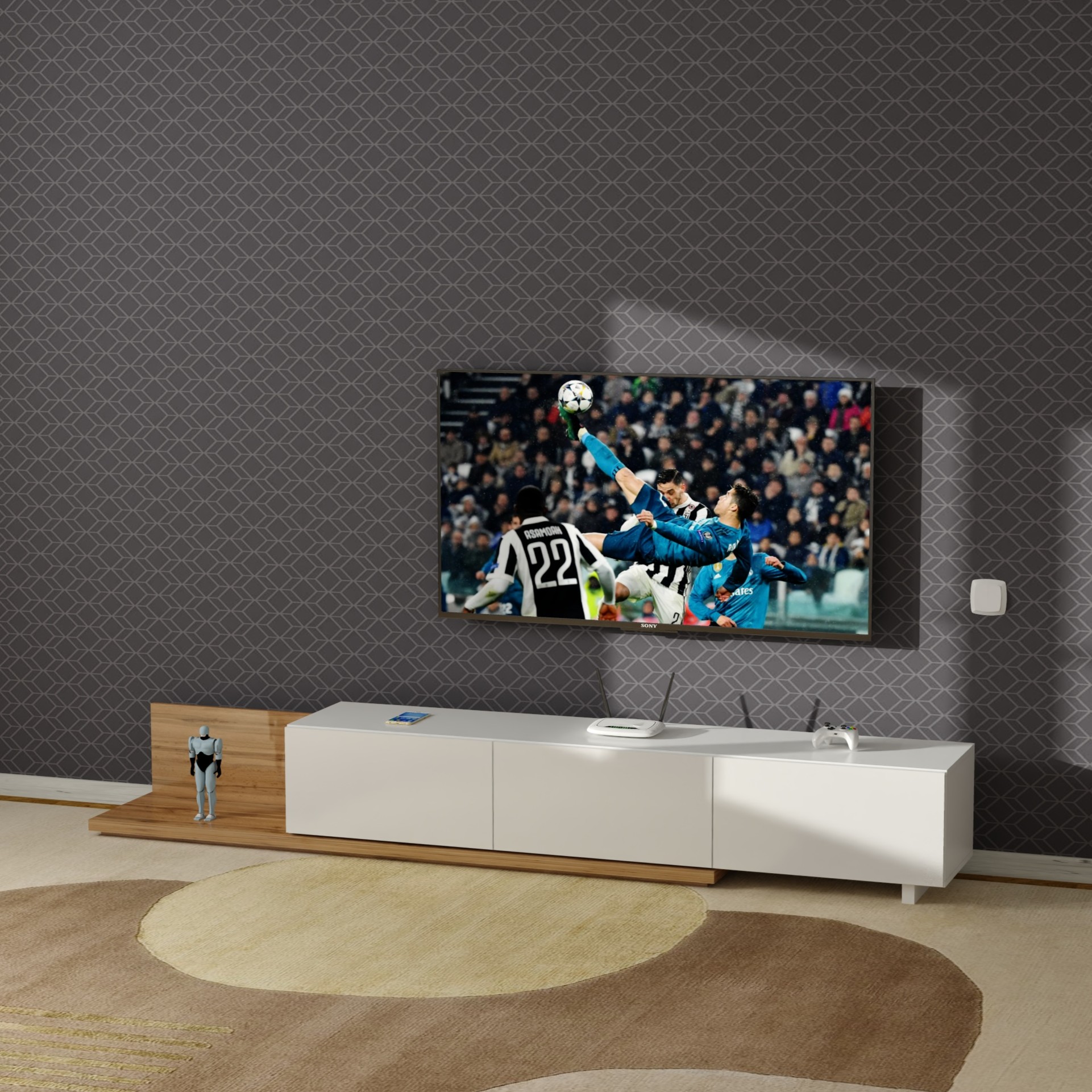 Лаконичный корпус в матовом белом исполнении гармонично сочетается с теплым древесным основанием, создавая эффект «парящей» конструкции и добавляя интерьеру визуальной легкости. Чистые линии и отсутствие лишней фурнитуры подчеркивают статусный, архитектурный характер модели.